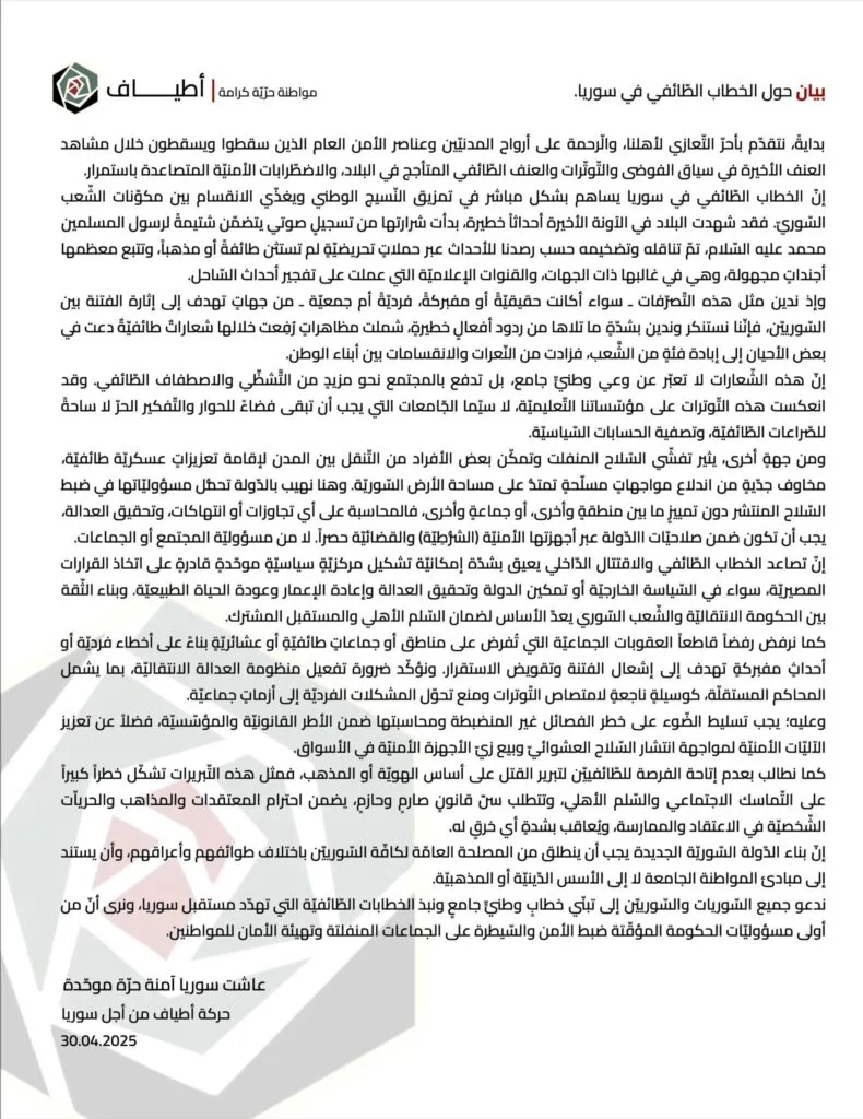 بدايةً، نتقدّم بأحرّ التّعازي والتّرحم على أرواح المدنيّين وعناصر الأمن العام الذين سقطوا ويسقطون خلال مشاهد العنف الأخيرة في سياق الفوضى والتّوتّرات والعنف الطّائفي المتأجج في البلاد، والاضطّرابات الأمنيّة المتصاعدة باستمرار.