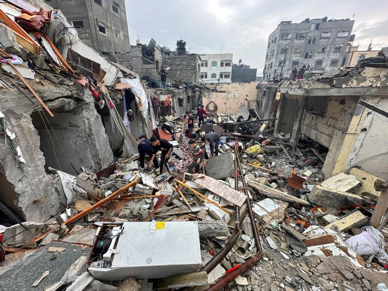 فلسطينيون يتفقدون آثار الضربات الإسرائيلية بين أنقاض المباني المتضررة في رفح بجنوب قطاع غزة